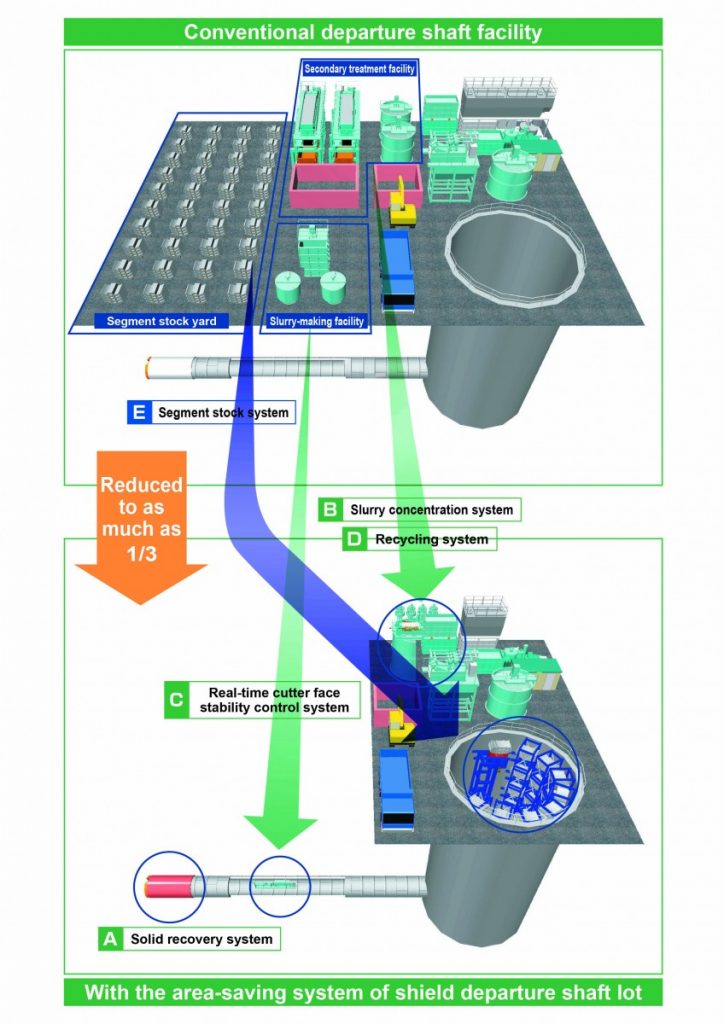 The area-saving system of shield departure does not simply stratify facilities but rather reduces the shield departure lot to 1/2 to 1/3 of conventional systems (in case of slurry shield) by combining technological elements, such as reducing the facility size itself. It also reduces construction sludge by collecting soil from clayey soil mounds in a solid form and increasing the primary treatment soil. Since no agent is added to the concentrated slurry, it can also be reused as fluidization treated soil.