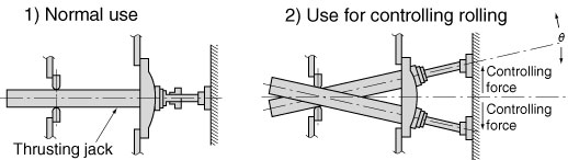 Rolling of the shield machine is controlled by component force of thrusting jack by shifting along the circumference of the machine, and rolling control jacks placed on the longer sides of the machine.