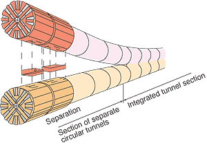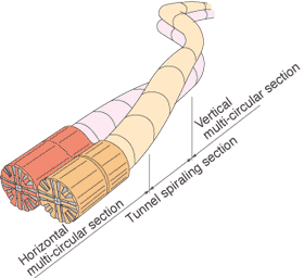 Spiraling tunnels can be constructed using integrated segments in the section where two tunnels are combined and twisted. Segments for ordinary single-circular tunnels can also be used for constructing separate close tunnels.