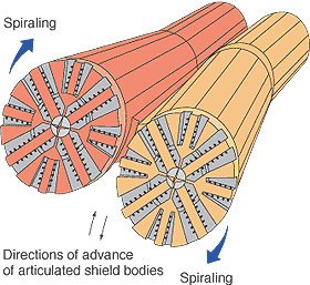 The cross articulation system enables free control of machine steering and orientation, and continuous change of multi-circular cross section from horizontal to vertical alignment or vice versa.