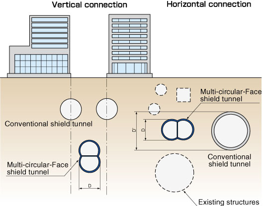 Vertical or horizontal connection of multiple circular sections are effective in congested underground spaces. - Use of structurally stable circular shapes